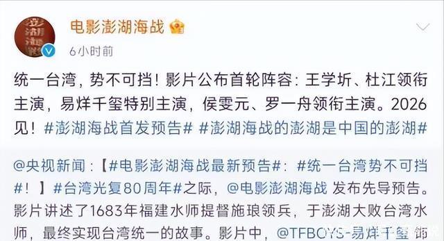 再看宣发,央视网直接下场转发预告,还明明白白标注中宣部重点影片,配文统一势不可挡,连剧情都给介绍了。 1683年施琅打澎湖,实现台湾统一,易烊千玺演27岁的康熙,王学圻演63岁的施琅,阵容摆这儿,就不是小打小闹的片子。